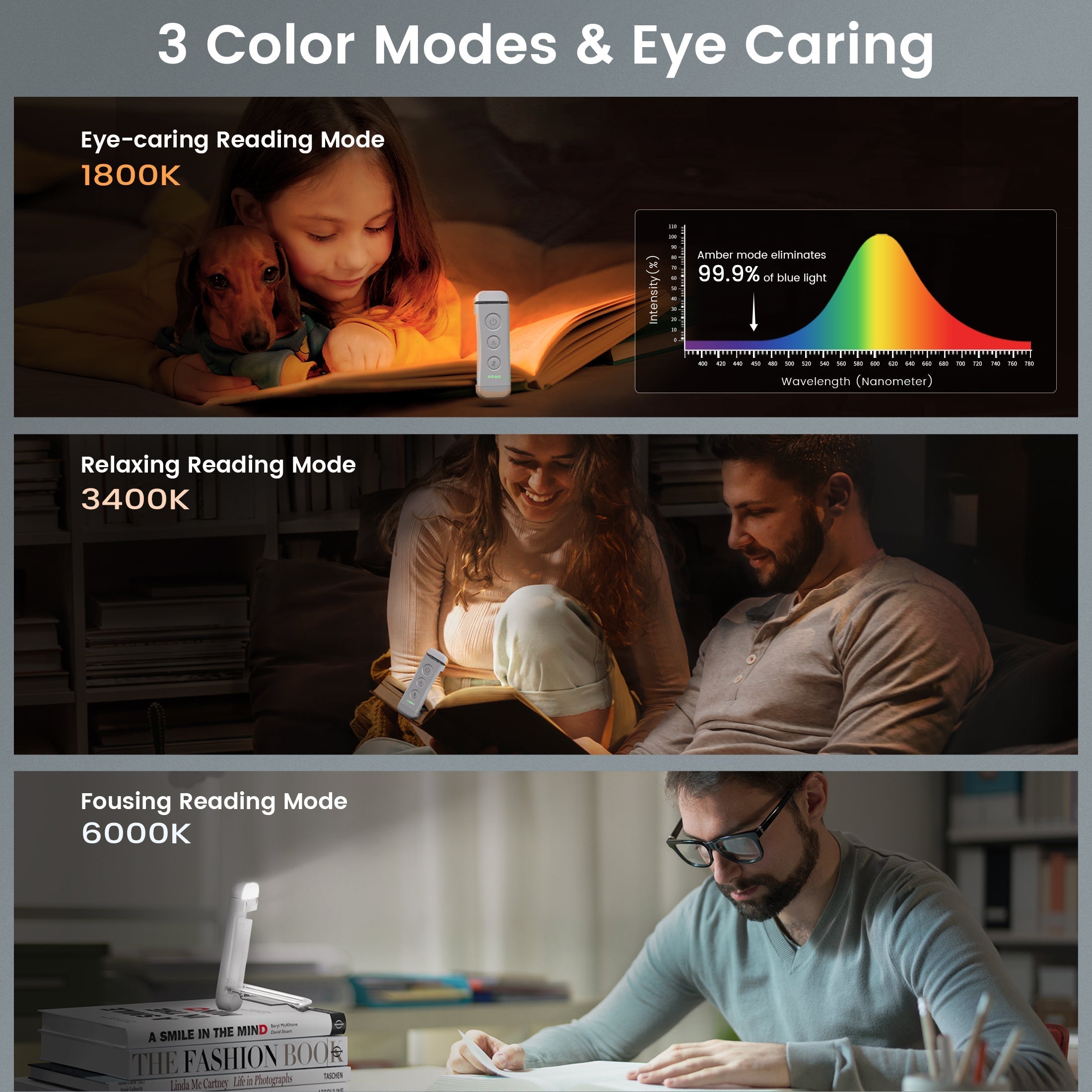 [3 Color Modes & Eye Caring]This tiny book light has 3 different color modes: amber reading mode(1800K). breezy reading mode(3400K). and precise reading mode(6000K). The amber book light filters 99.9% blue light to protect your eyes and to reduce your eye strain. The breezy reading mode provides you with a happy and comfortable reading world for novel reading & poem reading. The precise reading mode highlights the area clearly so you can concentrate on every detail of your book.